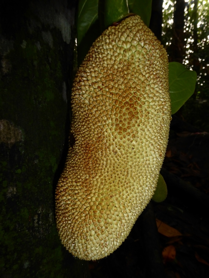 Der Jackfruchtbaum Artocarpus heterophyllus gehört zu der Familie der Maulbeergewächse (Moraceae). Er wächst als immergrüner Baum und kann Höhen von etwa 20 m erreichen. Die Rinde des Jackfruchtbaum sondert bei Verletzung eine Milch ab. Bein Schneiden von Ästen tritt diese reichlich aus. Die Blütenstände und entsprechend die Früchte werden an Stamm, Ästen oder Zweigen gebildet (Kauliflorie). Die Frucht des Jackfruchtbaum kann bis zu einem Meter lang werden und über 15 kg schwer. Sie ist ein Fruchtverband aus vielen Streinfrüchten. Die Frucht ist essbar. In der ursprünglichen Heimat (Indien, Südostasien) wird die unreife Frucht gekocht als Gemüse verwendet, die reife Frucht ist sehr süß und saftig. Sie wird als Obst, Trockenobst, Saft, Chips (trocken wie Apfelchips) und Süssigkeit verwendet. Die hier gezeigte Frucht ist noch nicht reif (die ist ja auch viel zu klein :-) ). Reife Früchte oder Einblicke ins Innere kann ich hier leider nicht liefern.