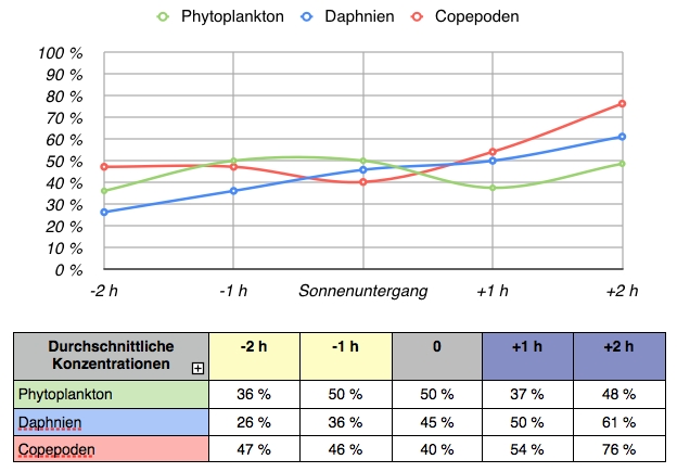 Die größte Frage auf die ich noch eine Antwort suche sind die Tiefpunkte von Phytoplankton (1Std. nach Sonnenuntergang) und von den Copepoden (während Sonnenuntergang) kennt sich jemand dafür gut genug mit dem Thema aus ?  ???  (fressen Daphnien Copepoden ?)