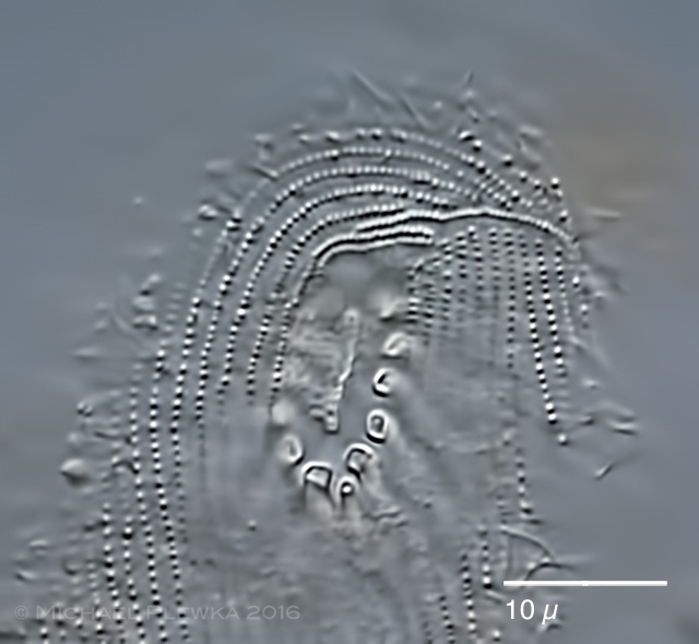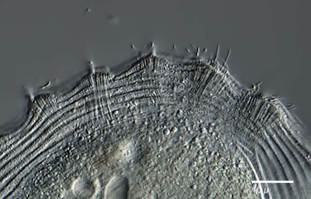 Loxophyllum verrucosum , ein pleurostomatider Ciliat mit einem charakteristischen Extrusomensaum. Die Extrusomen sind in Nestern angeordnet, zu jedem Nest gehört  mindestens ein ,,Stachel", der ,,nach oben" orientiert ist. ,,nach oben" steht deshalb in Anführungszeichen, weil die Stacheln zwar in diesem Bild dem Beobachter zugewandt sind, dieses aber eigentlich die rechte Seite des Ciliaten zeigt (wenn ich die Legende zu L. maleagris in Foissners Revision richtig verstanden habe):