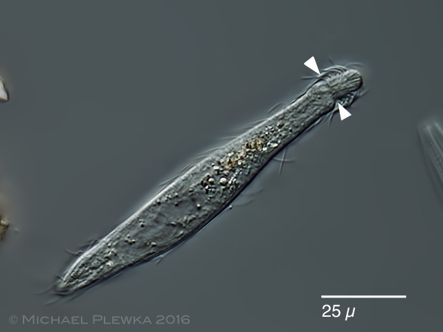 3. Der letzte Ciliat, den ich hier vorstelle, ist ziemlich mit 90µm recht klein und  gehört zur Gattung Lacrymaria, die vielen Tümplern durch das ,,Tränentierchen" (Lacrymaria olor, Wassertropfen) bekannt ist. Lacrymaria hat einen ,,Kopf", der durch eine Furche vom Rest der Zelle separiert ist (Pfeilspitzen). Hier gezeigt ist L. salinarum: