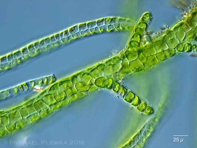 Der Thallus der  einzigen Grünalge, die sich in der Probe fand, ist von eine fädiger Struktur, dabei treten ab und zu Verzweigungen auf. Dabei besteht ein Faden im Querschnitt aus 3 oder mehr  Zellen, wie ich es von der Gattung Enteromorpha, die im Brack-und Meerwasser lebt, kenne: