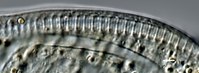 Ich habe verdunstetes Wasser in dem Präparat durch demineralisiertes Wasser ersetzt, was für die Viecher ziemlich letal war. Interssanterweise traten hierdurch  bei dem zuvor schon gezeigten Chlamydodon die Ringe des  quergestreiften Bands deutlich zutage: