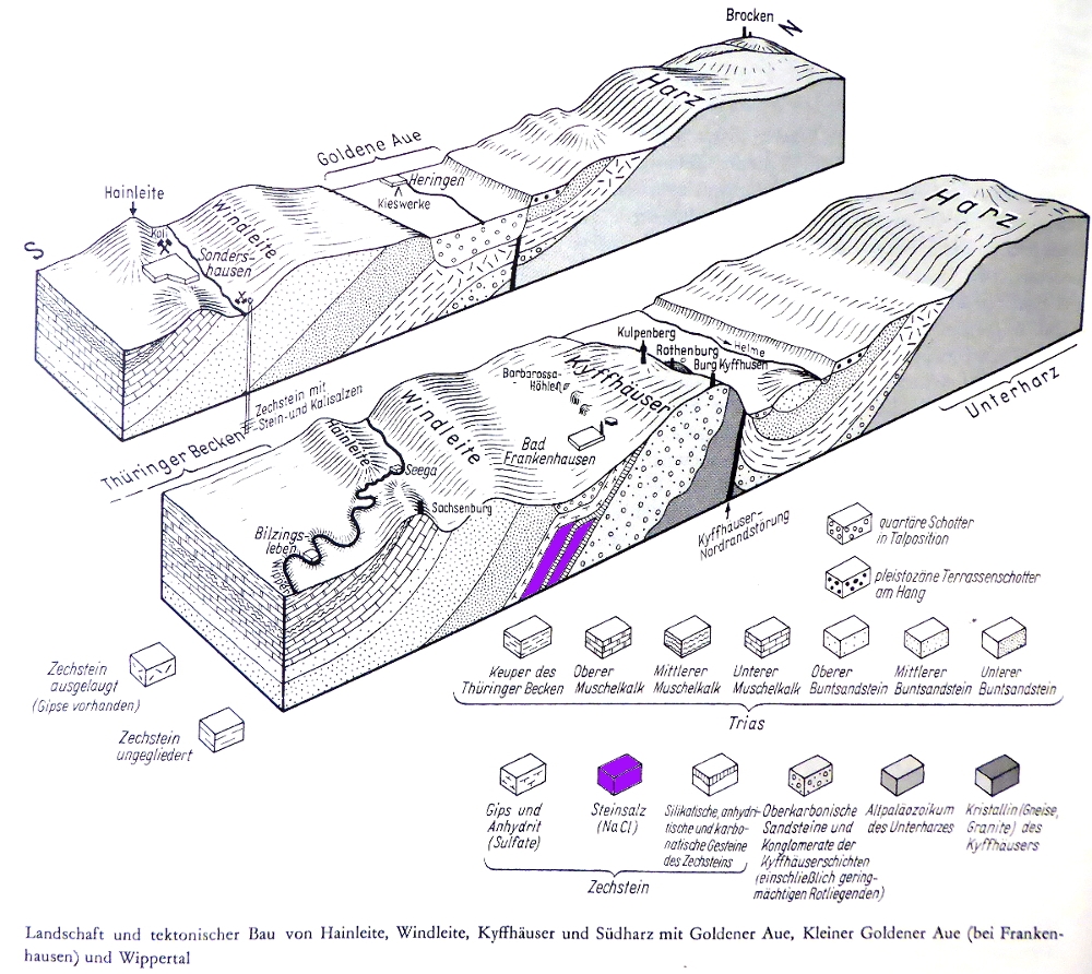 die Geologie rund um den Kyffhäuser ist recht komplex. Eine gute Einführung bietet Wagenbreth/Steiner: "Geologische Streifzüge". Salzschichten wurden beim Herausheben des Kyffhäusers mitgekippt und nahezu senkrecht gestellt. Sie werden vom Sickerwasser ausgelaugt, was immer wieder zu Erdfällen führt. Salzhaltiges Wasser tritt in mehreren Quellen zu Tage, unter anderem in der bekannten Solequelle Artern, aber auch in Bad Frankenhausen. Hier mal eine Grafik aus dem oben genannten Buch (farbliche Hervorhebung der Salzschichten von mir):