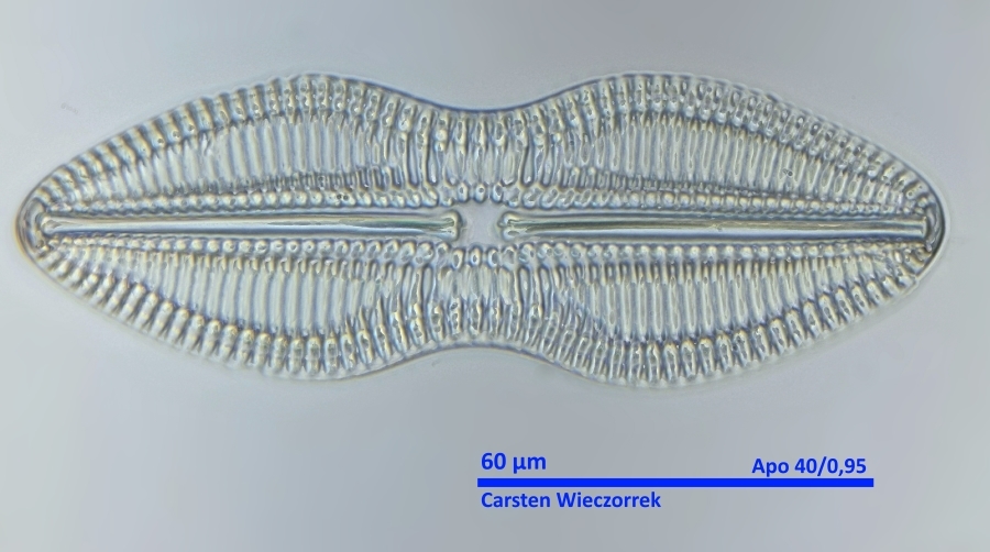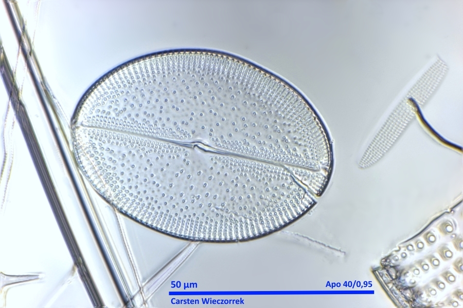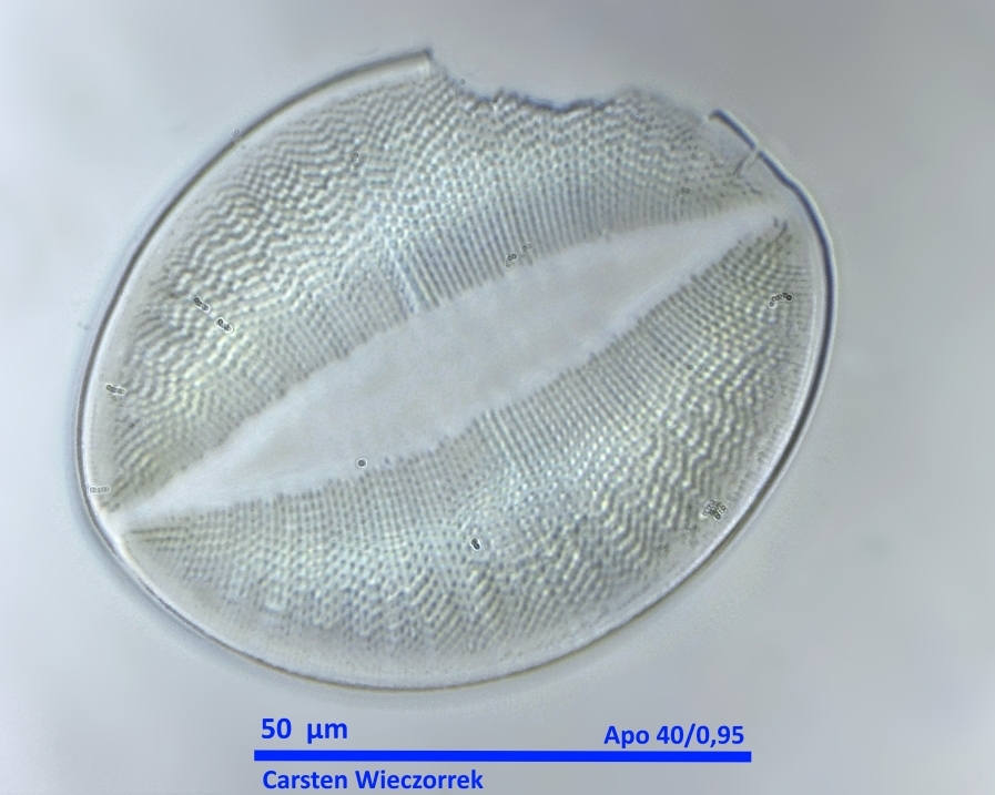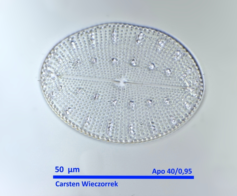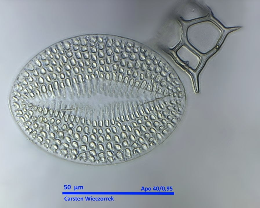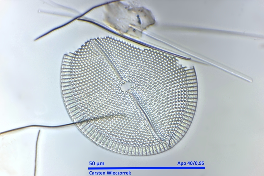 Vor einiger Zeit habe ich mir eine Diatomit-Probe aus dem Miocen gekauft. Diese habe ich nun aufbereitet (HCL-H2O2-Natriumkarbonat und Diphosphat + 30 µm Sieb) und erste Streupräparate erstellt. Hier kommt eine erste Übersicht. Die Bilder sind alle mit PICOLAY gestackt (etwa 8 Bilder je Stapel) und auf 900 Pixel Breite herunter gerechnet. Da das Naphrax noch feucht ist, habe ich noch keine Öl-Immersionsaufnahmen gemacht, alle Bilder sind "nur" mit de, 40er Objektiv erstellt.