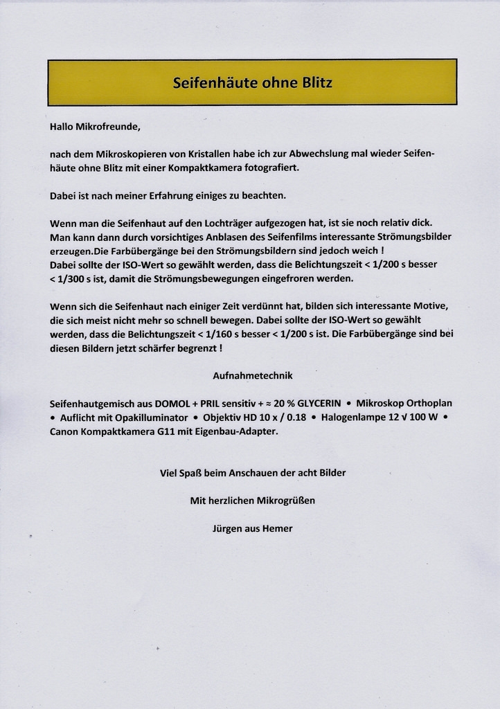 Vielen Dank für deinen wertvollen Hinweis, der es Mikrofreunden die keine Auflichteinrichtung besitzen ermöglicht, mit einem einfachen Eigenbau Seifenhautbilder zu fotografieren.