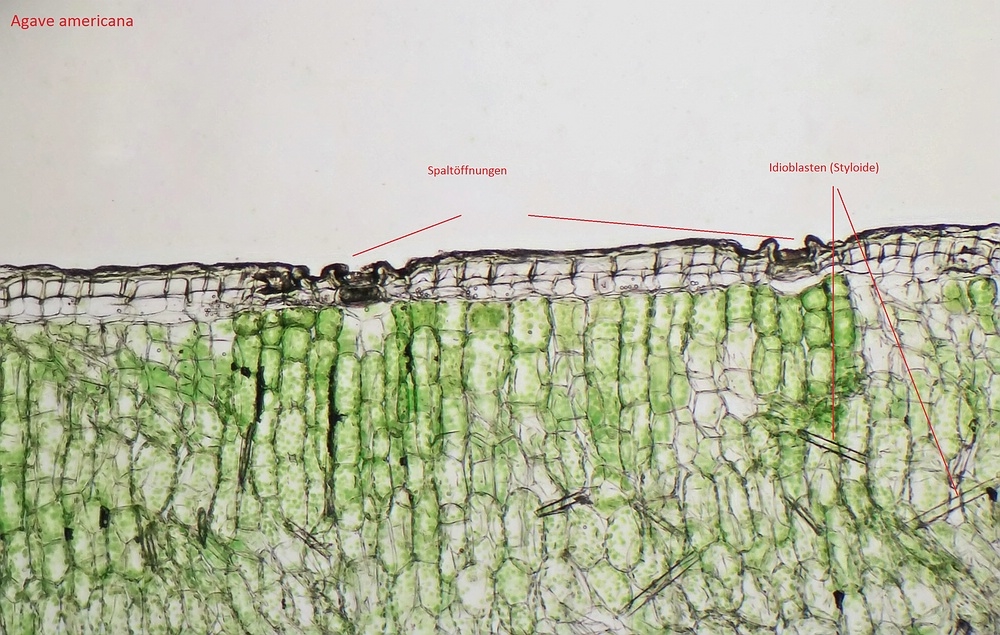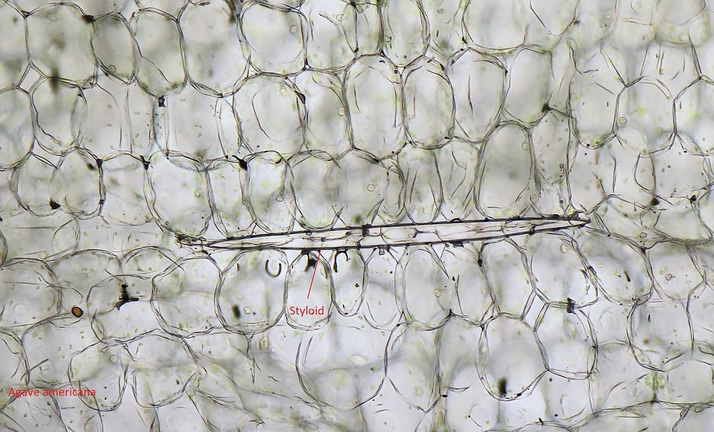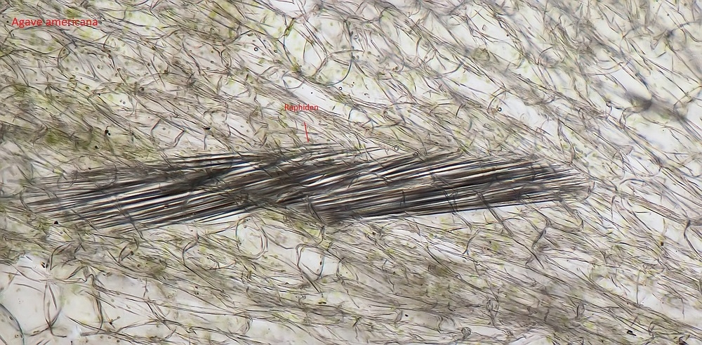Wanner beschreibt im "Mikroskopisch botanischem Praktikum" die Präparation und Beobachtung von Kristallidioblasten an "Agave americana".