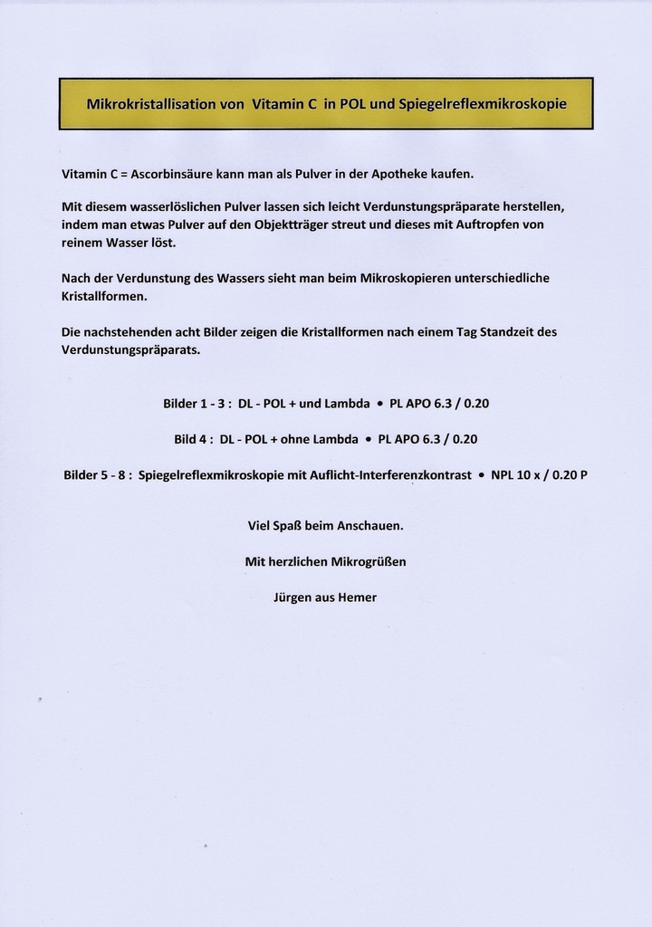 Mikrokristallisation von " Vitamin C " in POL und Spiegelreflexmikroskopie