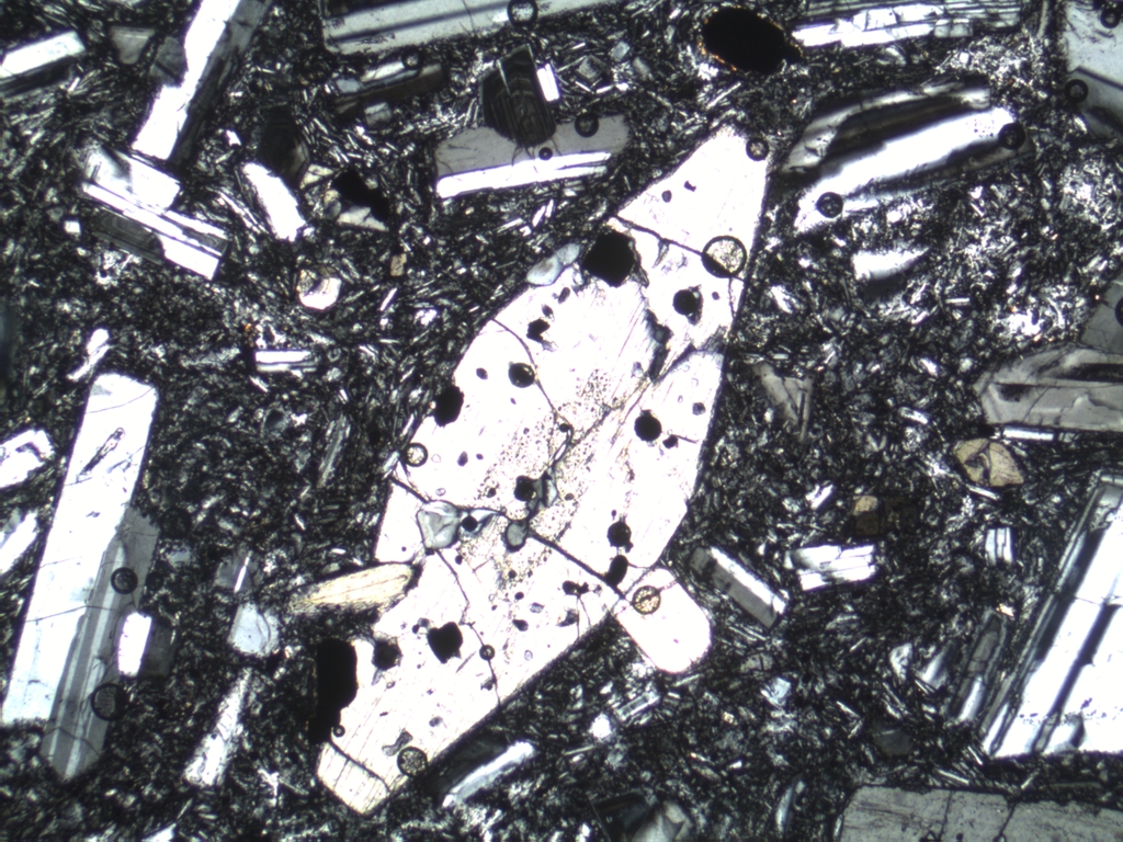 ich vermute stark, dass es sich bei dem Kristall auch nur um einen Plagioklas handelt. Sieh ihn Dir doch einmal im normalen Licht bei mäßig zugezogener Aperturblende an. Wenn er dann genauso aussieht wie die sicheren Plagioklase, ist's einer. Wenn er aber rauher aussieht, müssen wir weiter untersuchen.