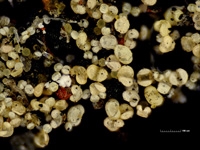 Auch wenn es den Anschein erweckt, ich würde wie ein Rohr im Winde schwanken mit meiner Interpretation: Nach der Annäherung an die Milben kehre ich nach Ihrer vorzüglichen Fotobearbeitung zurück zur Pollen-Theorie. Das sind ja doch ganz klar Koniferenpollen, wie ich in diesem Thread schon vermutet hatte. Das sind keine aufgeplatzten oder -gerissenen Eihäute, sondern völlig geschlossene Pollen mit Luftsäcken. Mein Urteil war etwas unsicher gewesen, weil ich noch keine Koniferenpollen im Auflicht-Dunkelfeld betrachtet hatte. Aber Ihr Foto beseitigt nun die Zweifel.