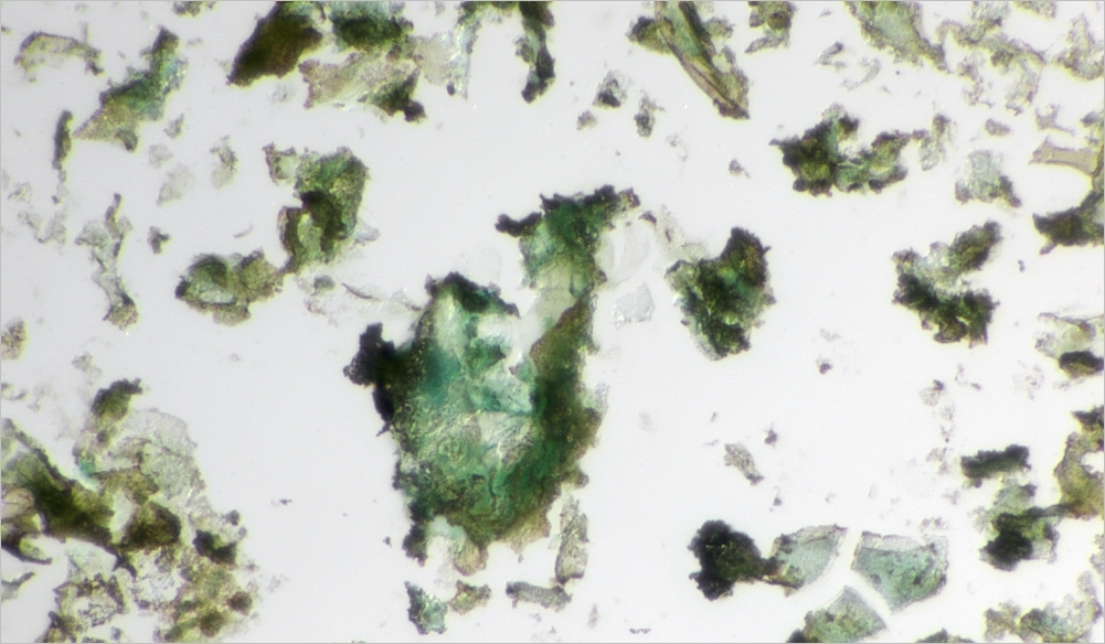 Aus einem Zinksulfat-Lösung wurde mit einem Tr. NaOH das Hydroxid gefällt. Zu diesem Gel ein Tr. Co(II)-Lösung und ab mit der Paste auf den OT und dort dünn verstreichen. Mit einem Crème-brulée-Brenner vorsichtig bis zur Rotglut erhitzen und das Ergebnis mikroskopisch kontrollieren.