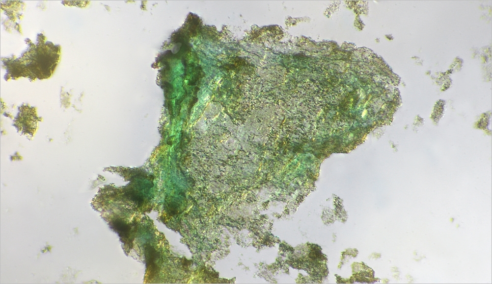 Einige Körnchen sind deutlich gefärbt. Der OT hatte sich allerdings eine Spannungsdoppelbrechung eingehandelt, wodurch der Hintergrund bei x-Pol. inhomogen wurde.