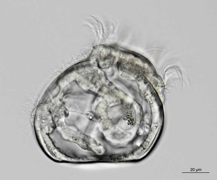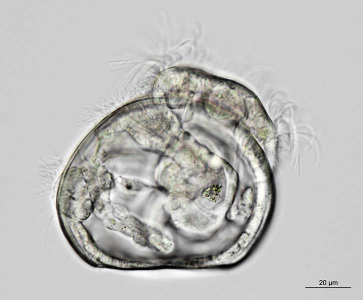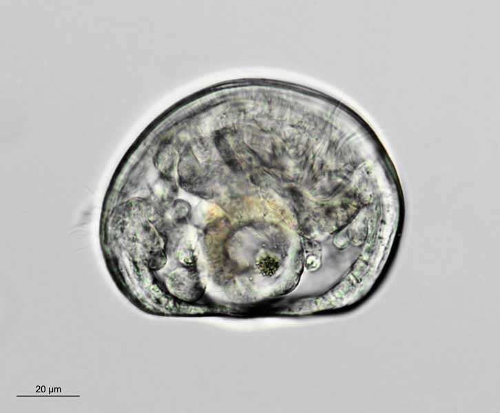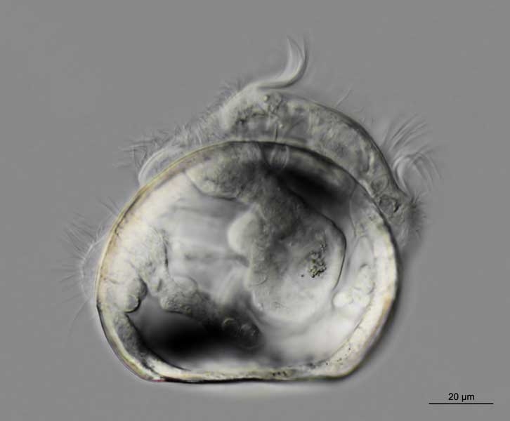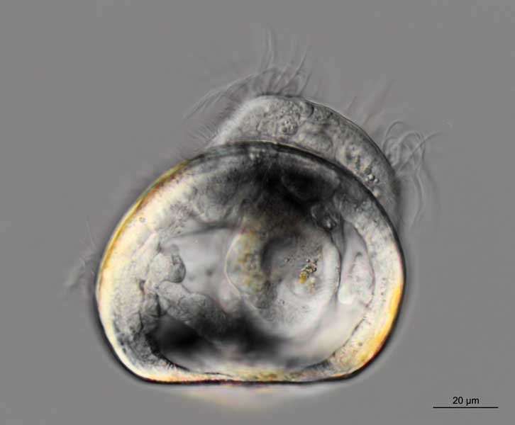 die Wander- oder Zebramuschel Dreissena polymorpha gehört zu den Süßwassermuscheln, die ein freischwimmendes Larvenstadium durchlaufen. Diese sog. Veligerlarve hatte Reiner Teubner gestern mit seinem Planktonnetz in Seligenstadt aus dem Main gefischt.