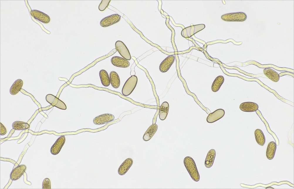 Die Konidien sind so groß, dass man sie im Gelände schon mit bloßem Auge erkennt. ;) Deshalb hab' ich auch nicht gemessen, laut Literatur um die 50µm.
