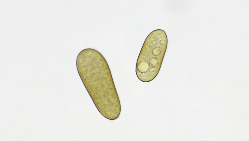 Hier noch einmal zwei Konidien mit dem 40er, ebenfalls schief beleuchtet: