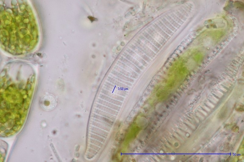 Zunächst mal fokussiert auf die Ränder zur optimalen Größenbestimmung. Die Alge ist ca. 90x15 µm groß.
