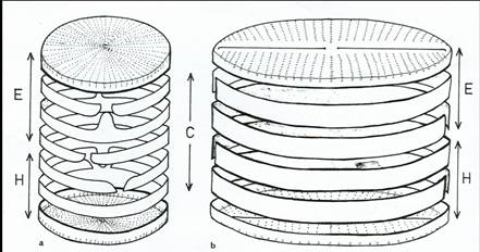 Nach Deiner Erklärung ist der Rahmen nicht ,,integralerer" Bestandteil der Schalen sondern ein eigenständiges ,,Kieselsäure-Element"  des Skeletts der Diatomeen, das die beiden Schalen (mit ,,organischen Kitt"?) zusammenhält und zur  Trennung  der Schalen frei werden muss.