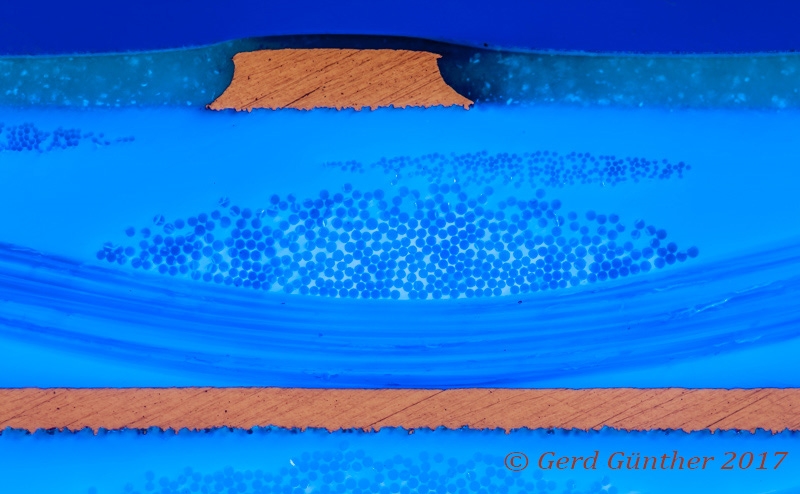 interessant, so habe ich das noch nicht gesehen; schönes Foto. D.h. der Bogen oberhalb des unteren Kupferlayers ist das Glasfasergewebe in Querrichtung? Die Punkte darüber sind das Gewebe in Aufnahmerichtung?