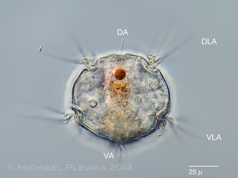Das Grundprinzip des Ruderns ist auch bei Polyarthra verwirklicht, allerdings wesentlich komplexer als bei FiliniaPolyarthra besitzt insgesamt 12 ,,Paddel"  mit gezähntem Rand und artspezifischer Breite, die in Dreiergruppen an 4 Stellen des Rumpfs befestigt sind.  In der relativ ungewöhnlichen Perspektive als optischer Querschnitt kann man die Insertionsstellen erkennen (DLA: rückseitige seitliche Anhänge; VLA: bauchseitige seitliche Anhänge; bei P. vulgaris gibt es noch zwei kleinere ventrale Anhänge (VA), die aber nichts mit der Bewegung zu tun haben. DA: Rückentaster. Der orange Fleck ist ein Lipidtropfen). Die Insertionsstellen der rückseitigen (dorsalen) Paddel stehen enger zusammen als die der ventralen :