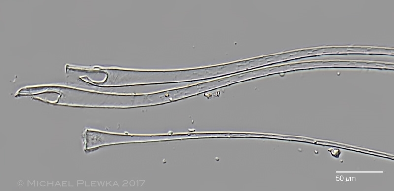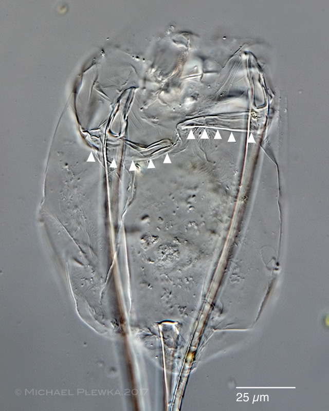 Die Springborsten sind Bildungen, genauer: Ausstülpungen der Epidermis und mit dieser durch  die zwei ,,Zinken" des gabelartigen Vorderteils flexibel verbunden. In der Seitenansicht auf dem folgenden Bild erkennt man weiterhin, dass der Vorderrand des Rumpfs stark kutikularisiert ist (markiert durch die Dreiecke):