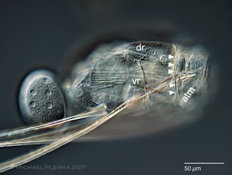Diese Versteifung dient als Ruderlager (in diesem Fall: Keipen >> siehe Wikipedia), wenn Filinia den Kopf einzieht. Dieses wird durch die dorsalen (dr) und ventralen (vr) Retraktoren (erkennbar als quergestreifte Muskelbündel) sowie den vorderen Quermuskel (atm) bewirkt. Die Lage der Muskeln nochmals in Dorsoventralansicht: