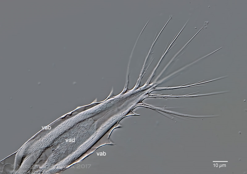 Der unpaare Ventralanhang, im Bild links zu sehen, ist von allen Anhängen der größte, besitzt aber nicht so lange Borsten wie die anderen. Während bei Filinia und Polyarthra die relativ steifen Borsten bzw. Paddel indirekt angetrieben werden, sind die Körperanhänge bei Hexarthra intern mit quergestreiften Muskeln ausgestattet und an manchen Stellen flexibel (man beachte das wellenförmige Integument  im Bereich der  Beschriftungen im Ausschnittsbild). Man unterscheidet hier zwischen Abduktoren, die außen liegen, und Adduktoren, die innen liegen. Sowohl im Übersichtsbild als auch in dem Ausschnitt lässt sich erkennen, dass sich sie die Abduktoren (vab)  und Adduktoren (vad) des Ventralanhangs  in den Körper fortsetzen.