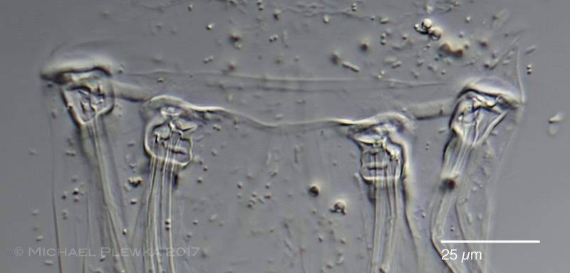 Das nächste Bild zeigt ein Trio der ventralen (bauchseitigen) Paddel, sowie die quergestreiften Muskeln, die diese Paddel antreiben.  Im Gegensatz zu Filinia besitzt Polyarthra für jedes Paddeltrio ein hochkomplexes Gelenk, wobei jedes Paddel einzeln aufgehängt ist. Man kann zumindest erahnen, dass die 3 Paddel im Ruhezustand übereinander angeordnet sind, ähnlich wie die zwei Flügelppare bei Käfern beispielsweise: