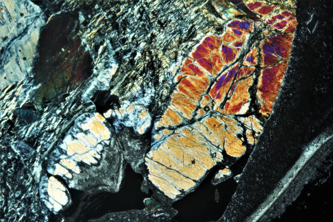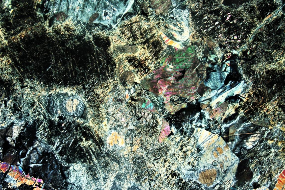 wenn ich mir alle Deine Bilder ansehe, möchte ich meine Meinung etwas korrigieren/präzisieren. Auf den ersten beiden Bildern sehe ich im Wesentlichen Serpentin und Magnetit. Das wäre dann ein Serpentinit. Bei den anderen Bildern erkennt man aber doch eine Menge (Volumenmäßig) höher doppelbrechende Minerale. Das sind wohl meist Ortho- und Klinopyroxene, aber auch Calcit. Dieser ist sicher sekundär und an den sich kreuzenden Zwillingslamellen erkennbar. Das Gestein könnte also auch ein serpentinisierter Lherzolith sein. Jedenfalls hat das arme Stück schon eine Menge mitgemacht und das Beste schon lange hinter sich.