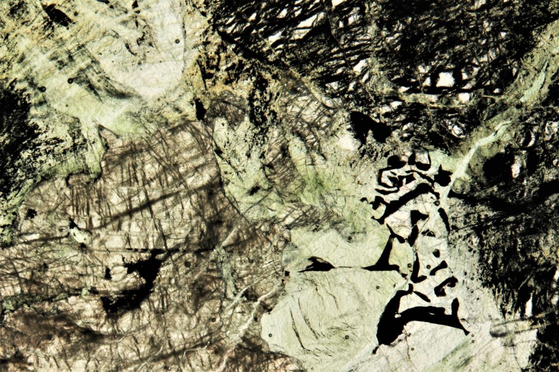 ein Bekannter hat diesen Kiesel vom Bodensee mitgebracht. Stammt also sicher aus den Alpen. er ist tief schwarzgrün und sah so interessant aus, dass ich Schliffe davon gemacht habe. Sind noch etwas dick, aber geben vielleicht doch einen ersten Eindruck. Die schwarzen Stellen sind immer schwarz. Erst HF, dann XPL. Alle Aufnahmen am Stemi Durchlicht. Vergrößerungen von 7x bis 50x.