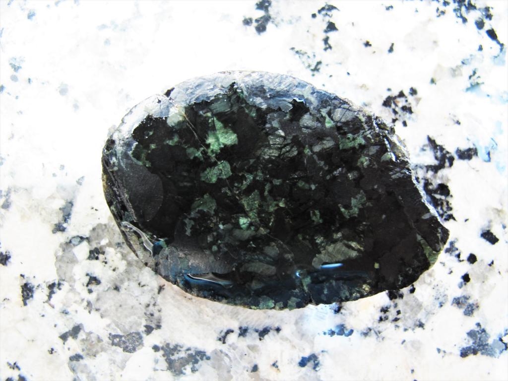 Hier noch 2 Bilder des Anschnitts: die eine Seite nicht besonders gut anpoliert, ich habs so belassen, wie ich es bekommen habe. Angefeuchtet, um etwas zu verbessern. Das Wasser perlt ab ist wohl noch Poliermittel drauf. Lange Seite 5 cm.