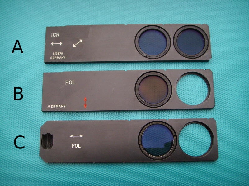 Was mich wundert ist, dass die Polarisationsrichtung bei diesen beiden um 90° gedreht ist. Das sollte doch wohl darauf hindeuten, dass sie für verschiedene Methoden vorgesehen waren, oder?  Leider kann ich in meinen Leitz-Unterlagen aber nichts Erhellendes dazu finden.  Weiß jemand vielleicht Näheres zu diesen beiden Schiebern bzw. deren Verwendung oder hat gar entsprechende Unterlagen?