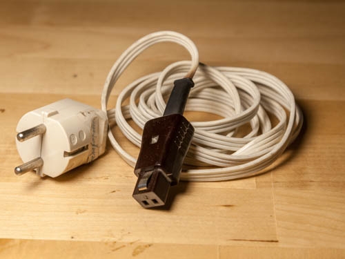 Der Vorgänger dessen was wir heute als Kaltgerätestecker bezeichen hat zumindest einen PE Leiter, ist aber ansonsten ebenfalls nicht vertrauenserweckend: Die Auflagefläche in der Buchse ist gering und alles andere als sicher, der Übergang zum Leuter verlötet anstatt mit Quetschhülsen verschraubt, die Tülle bei so großzügiger Hitze aufgeschrumpft dass sich die Isolation bereits verfärbte. Aufgrund der Lötverbindung und der Tülle kann hier kein modernes Kabel VDE-gerecht anageschlossen werden. Der einzige Weg wäre ein Austausch des Steckersystems.