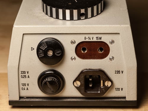 Rückseite, umschaltbar auf das 110V Netz, Sicherungshalter, zwei Buchsen für die Niedervoltseite und die Buchse für die Netzzuleitung.