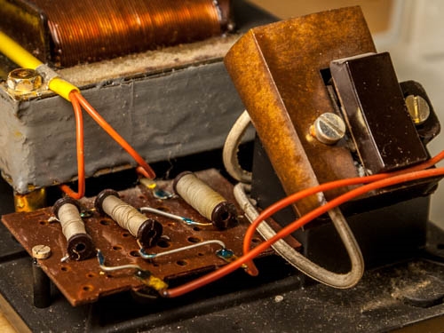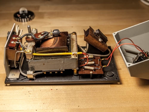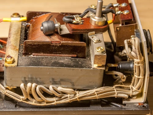 Uralttechnik im Inneren, die Ausgabespannung ist regelbar indem ein Hebel die Spannung direkt von der Sekundärwicklung des Trafos abgreift. Wer nur moderne Schaltnetzteile gewohnt ist, so wie ich, bekommt spätestens jetzt große Augen  :D  Sind doch alle Transformatoren heute vergossene Würfel...