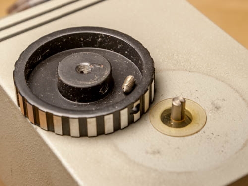 Der Weg ins Innere führt zuerst zum Drehknopf den man mittels einem langen, dünnen Schlitzschraubendreher entfernen kann. Die Kunststoffunterlegscheibe nicht verlieren.