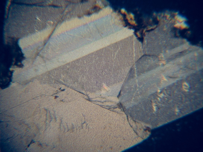 Meine Hoffnung war, unter dem Stemi (Technival 2) mit Polausrüstung die Platte soweit in dem geschmolzenen Malinol kippen zu können, bis eine völlige Auslöschung in allen Stellungen des Drehtisches erreicht wäre. Dann würde die kristallographische C-Achse genau senkrecht zur Oberfläche des Objektträgers stehen. Es gelang mir aber nicht eine Aulöschung zu erreichen. Inhomogenitäten im Kristall und leider sogar Zwillingslamellen, sowie Brechungserscheinungen im umgebenden Einbettungsmittel hellten das Bild zu sehr auf.