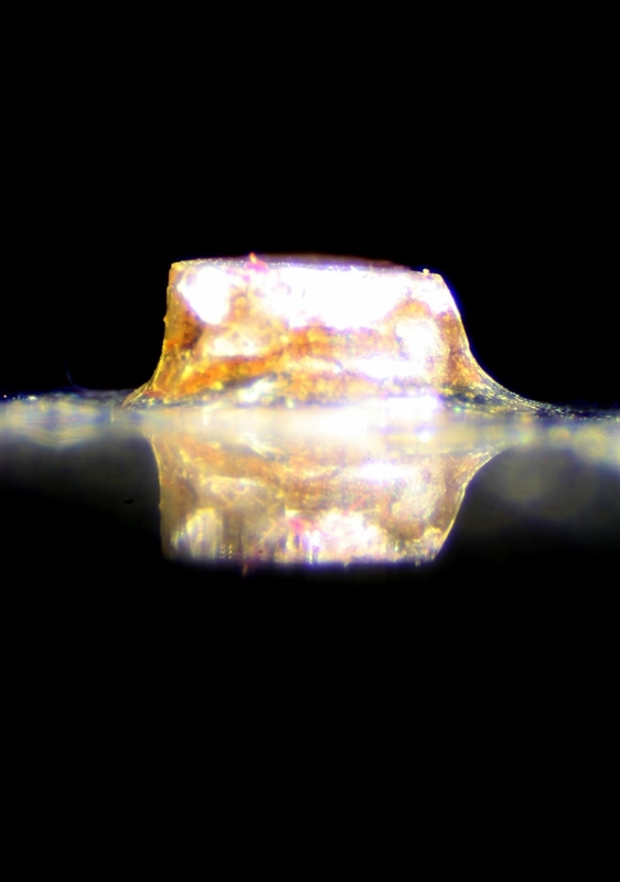 Trotz aller Vorsicht brach der Kristall  zweimal ab und musste wieder aufgeklebt werden. Nachdem die Spitze plan geschliffen war, konnte der Kristall umgedreht, d.h. mit der plangeschliffenen Fläche auf dem Objekträger aufgeklebt werden. Durch die plane Auflagefläche war das Ganze jetzt schon etwas stabiler. Das andere Ende des sulig-prismatischen Kristalles wurde jetzt ebenfalls abgeschliffen.