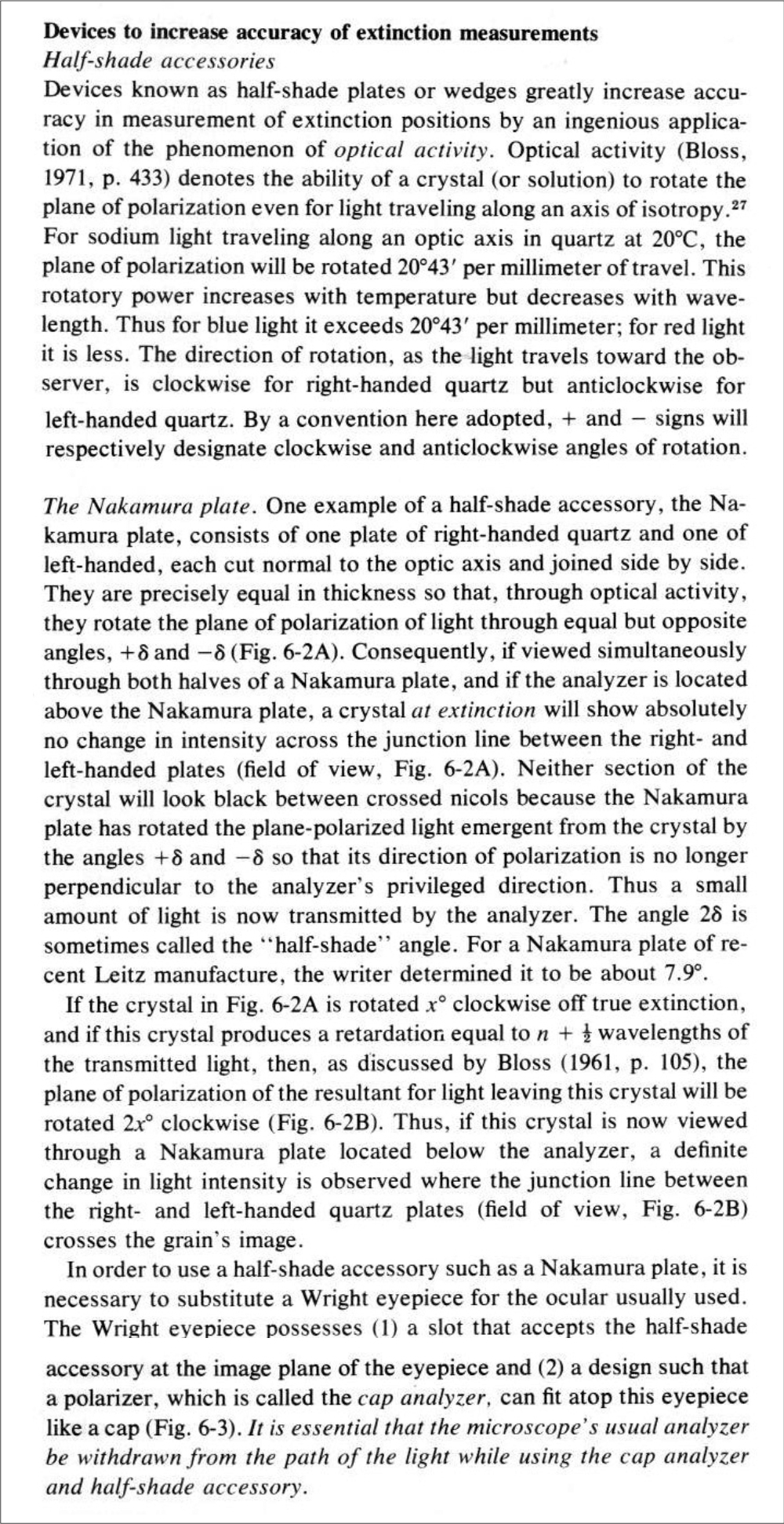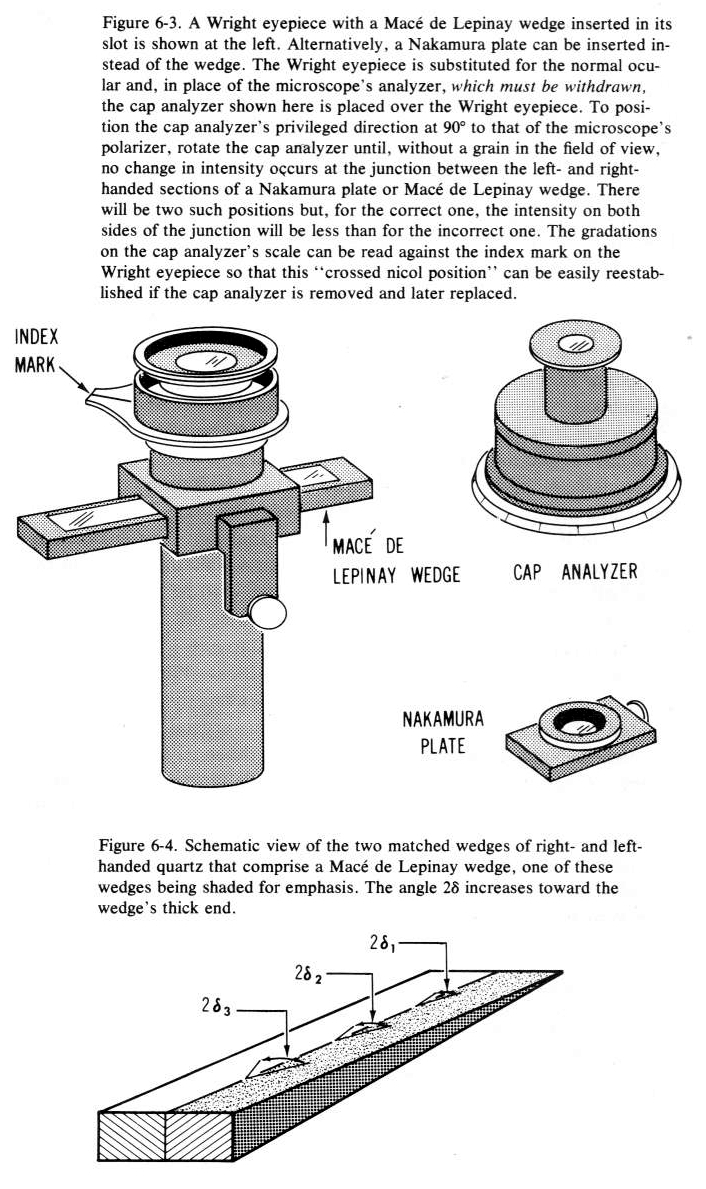 die wichtigste Anwendung des Wright-Okulars ist tatsächlich die Messung der Auslöschungslage von Kristallen (und damit deren Auslösschungsschiefe) mit Halbschattenplatten. Das menschliche Auge kann nur schwer oder garnicht den Unterschied zwischen tiefdunkel-Nachtschwarz und Nachtschwarz erkennen. Das Prinzip der Halbschattenplatte besteht darin, durch zwei nebeneinanderliegende optisch drehende Quarz-Kristalle das Gesichtsfeld in zwei Hälfen zu teilen, die statt in Auslöschungsstellung schwarz zu sein nun grau erscheinen. Wenn die Trennnaht der beiden Hälften über dem zu messenden Kristall liegt, erscheint dieser auch gleichgrau auf beiden Seiten falls er sich genau in Auslöschungsstellung befindet. Die kleinste Abweichung davon führt auf der einen Seite zu einem helleren Grau und der anderen Seite zu einem dunkleren Grau. Somit steigt die Messgenauigkeit erheblich.