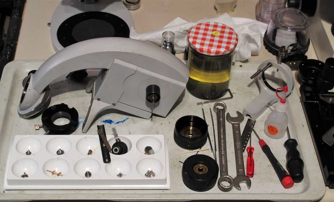 Meines ist auch aus einer Klinik und die klebrige Schmiere war überall. Das Stativ habe ich mit Isopropanol gut sauber bekommen. Kondensorträger war bombenfest, den Tisch habe ich nach dem Abschrauben nur mit einem Gummihammer runter klopfen können. Dafür waren die sonst immer breiartigen Gummifüßchen wie neu. Nach insgesamt 2 Tagen Arbeit ist das Mikroskop aber wieder fast neuwertig. Wenn man also die 10 h nicht rechnet eigentlich ein Schnäppchen.