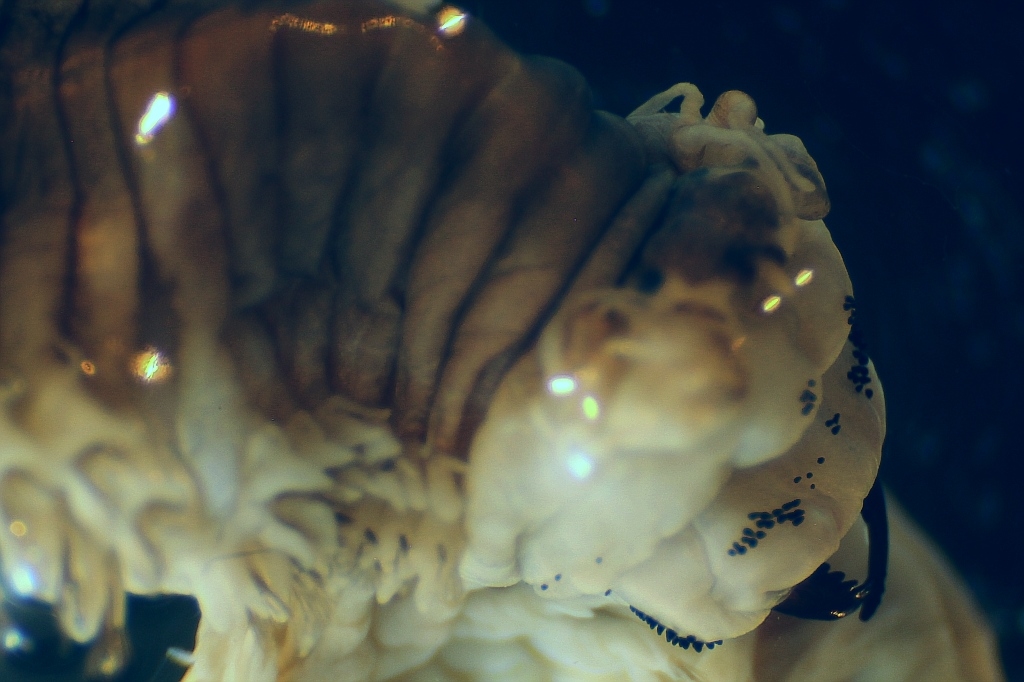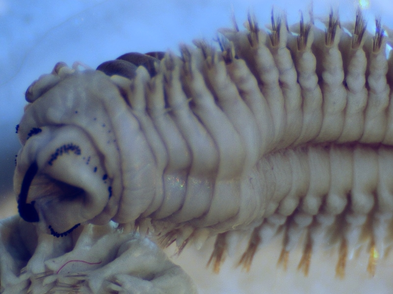 In Strandnähe am Boden oft zwischen Steinen finden sich u.a. an der Ostsee, woher dieses Viech stammt, deutlich segmentierte Würmer, die zu Lebzeiten meist grünlich gefärbt sind. Es dürfte sich dabei um den Seeringelwurm, Nereis diversicolor handeln. Der Name Nereis, d.h. ,,Meeresnymphe", erscheint beim Blick durch das Stemi aber als blanker Hohn - hatte denn der Meeresgott Nereus keine schöneren Töchter? Diese Namensgebung wird nur noch durch Aphrodite, Göttin der Schönheit, für die Seemaus überboten, die aus der selben Verwandtschaft kommt.