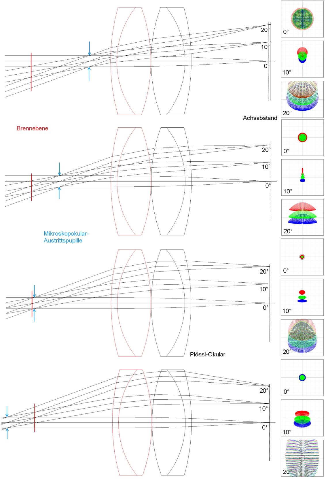 Folgendes Bild zeigt eine beispielhafte Berechnung der Abbildung eines Plössl-Okulars als Kameraobjektiv, mit unterschiedlichem Abstand zur Austrittspupille des Mikroskopes. Die Bildqualität hängt aber im Detail auch vom Austrittspupillendurchmesser und der Okularkonstruktion ab, ist also nur ein Beispiel der Abhängigkeiten.