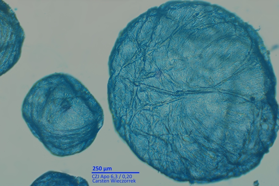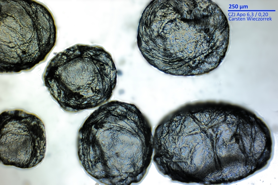 Interessante Bilder. Mir sehen die Kugeln tatsächlich wie fossile, geschrumpfte Hüllen von Pollen aus. Fossile Pollenhüllen sind vermutlich gar nicht so selten. Ich habe solche in Schollener Pelose gefunden. Du hast bei den Bildern offensichtlich auf die (tiefer liegende) Oberflächenstruktur und nicht auf die Ornamentstruktur fokussiert. Vielleicht erkennt man damit zusätzlich mehr.