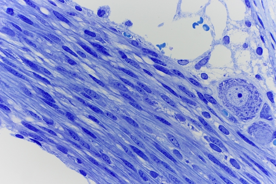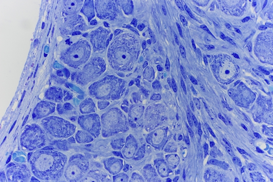 Nervenfasern im radix dorsalis mit viele Schwann Zell Kerne. Rechts ist ein große Neuron Zellkörper zu erkennen mit hellblauen Nukleolus.