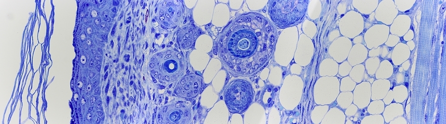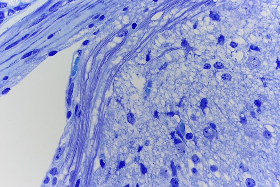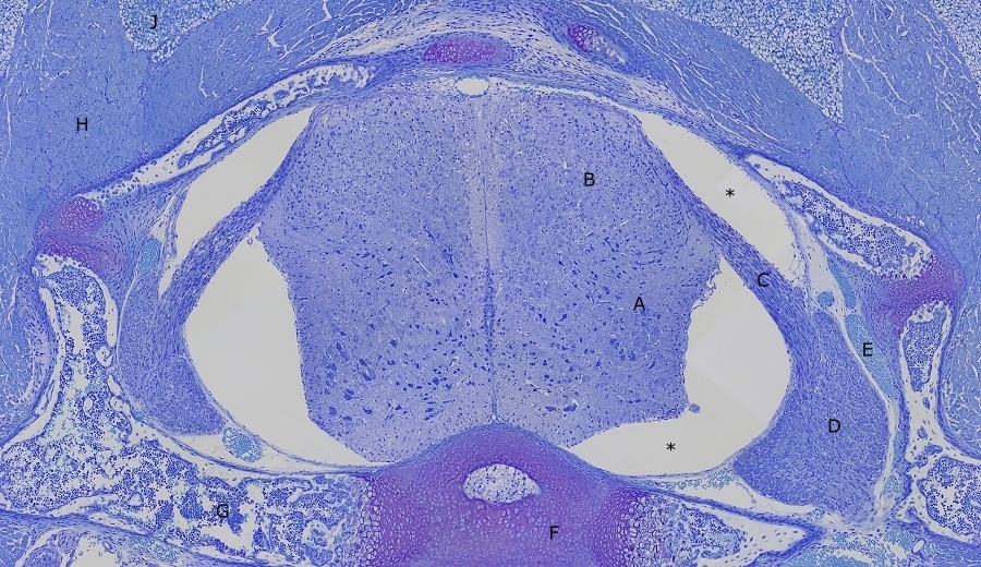 Meine erste Frage bezieht sich auf die zweite, mikrofotografische Aufnahme von oben. In dieser Abbildung ist unter anderem das zentral liegende Rückenmark und die lateral abgehende Radix dorsalis mit Übergang zum Spinalganglion zu erkennen. In dieser Abbildung wurden rechte und linke "Hohlräume" von Dir mit Sternen markiert und als Schrumpfartefakte ausgewiesen. Kann es sein, dass es sich hierbei primär nicht um Schrumpfartefakte, sondern im Anteile des subarachnoidalen Raumes handelt? In der Abbildung 4 von oben hast Du eine Detailaufnahme gezeigt, in der das Rückenmark und die flankierende Dura mater gezeigt wird. Wenn ich die Randbereiche beider Seiten betrachte, habe ich nicht den Eindruck, dass es zu einem zellulären Abriss gekommen ist, was die Vermutung stützen könnte, dass es sich tatsächlich um Anteile der angeschnittenen Subarachnoidalräume handelt.