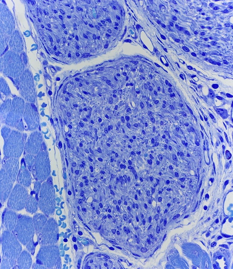 Hier sind einige Nerven quer geschnitten. Beachte die viele Kerne von die Zellen von Schwann aber auch die quer geschnittene myelinisierte Axone https://de.wikipedia.org/wiki/Axon die wie Punkte zu sehen sind.