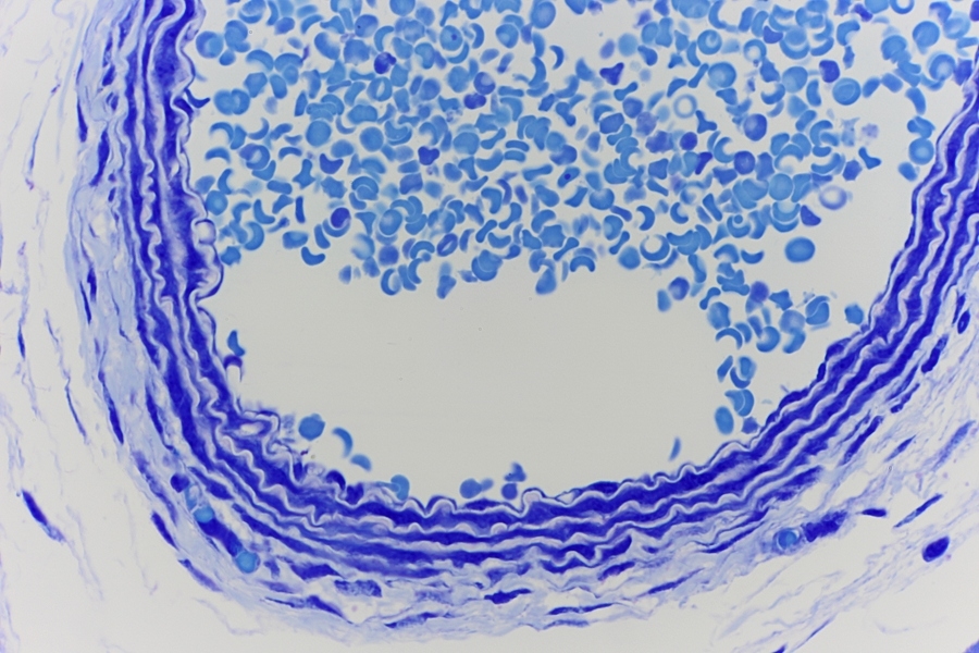 Ein Arterie mit viele Elastische Fasern und Selbstverständlich Blutzellen.