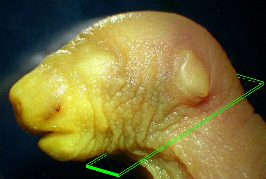 Den Kopf habe ich von das Leib getrennt und im ganzen Fixiert. Fixiert wurde in ein Gemisch von Formalin und Glutaraldehyde (2%, 2,5% nach Karnofsky). Die Fixierte Kopfe habe ich entwässert bis 80% und dann zerschnitten in brauchbare teilen. Das Schneiden von solche große Teile geht bei mir am besten in ein Petri Schale die ein Zentimeter dick abgefüllt ist mit 80% Ethanol oder, wie bei mir, Isopropanol. Die Petrischale Positioniere ich unter mein Stereomikroskop und mit ein altes Mikrotommesser kann ich so sehr bequem den Kopf zerlegen ohne das mein Gewebe austrocknet.