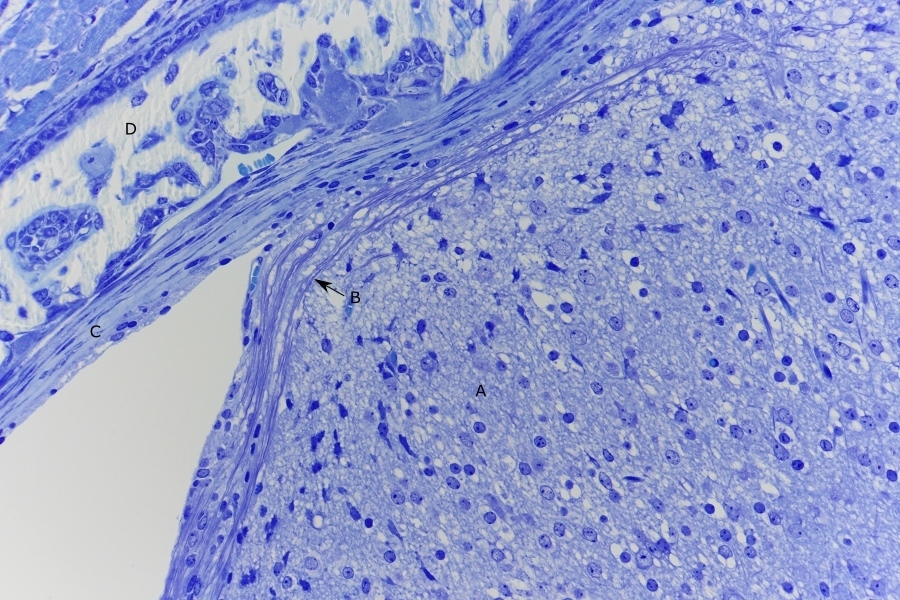 B = Rückenmark mit wahrscheinlich weiße Substanz (weil hier die meisten Nervenfasern zu sehen sind)