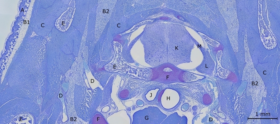 In mehreren Deinen Aufnahmen sind knorpelige Anteile zu erkennen, die vermutlich im Zuge einer enchondrialen Ossifikation verknöchern werden um sich zu belastbaren Wirbelkörpern zu entwickeln. Leider handelt es sich bei diesen knorpeligen Anteilen nicht um frühes Gewebe des Larynx (dem Kehlkopf). Der Larynx wäre aus phylogenetischer Sicht außerordenlich interessant, da ja viele Nager auch ein, wenn auch begrenztes Repertoire an Lauten von sich geben könnnen (und hierbei meine ich nicht das Geräusch, das ensteht, wenn die Mausefalle am Dachboden weidmännisch die Maus erlegt). Nicht zuletzt ist es der Larynx, der dem Menschen zu Sprache und somit zu Kommunikation verholfen hat. Das biogenetische Grundgesetzt nach Heckel besagt, dass in der Ontogenie die Phylogenie rekapituliert wird, was bedeutet, dass in der Entwicklung des Einzellebewesens, die Stammesentwicklung wiederholt wird. Unter diesem Gesichtspunkt ist eine vergleichende, histologische Untersuchung des Larynx besonders interessant! Hier könnte ich helfen.