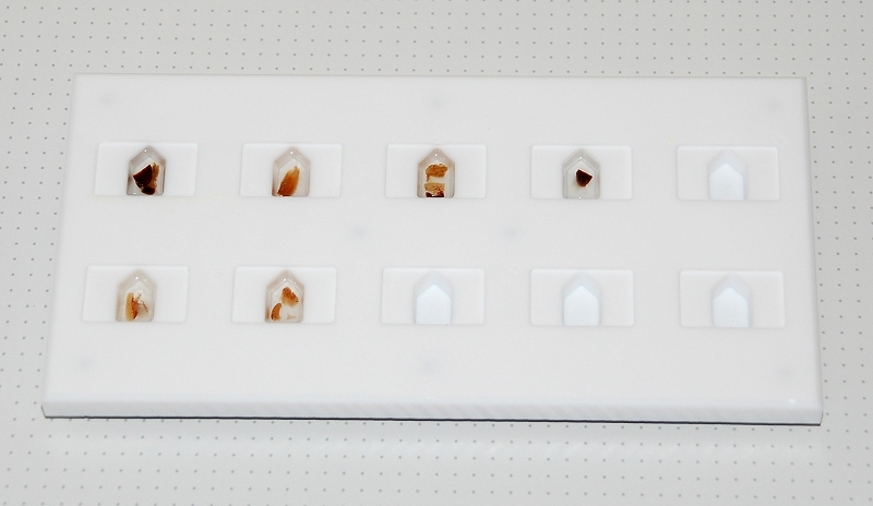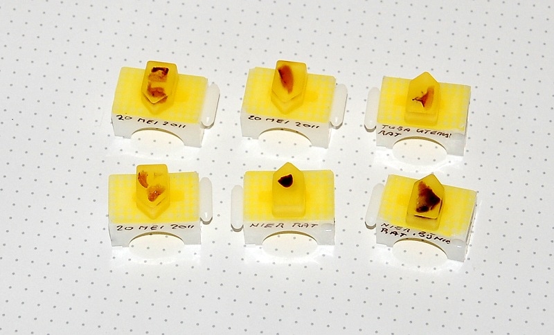 In die Bilder von die Technovit Blöcke sehe ich gerade das hier noch einige Blöcke dabei sind wo zwei Teilen Gewebe eingebettet ist. Das habe ich am Anfang mal versucht wegen Kosten Reduzierung aber das sollte man nicht machen. In ein Mold gehört nur ein Stuck Gewebe. Den Grund dafür ist das ein Block mit nur ein stuck Gewebe sich viel besser schneidet.