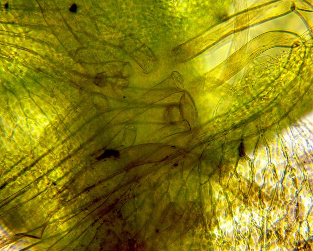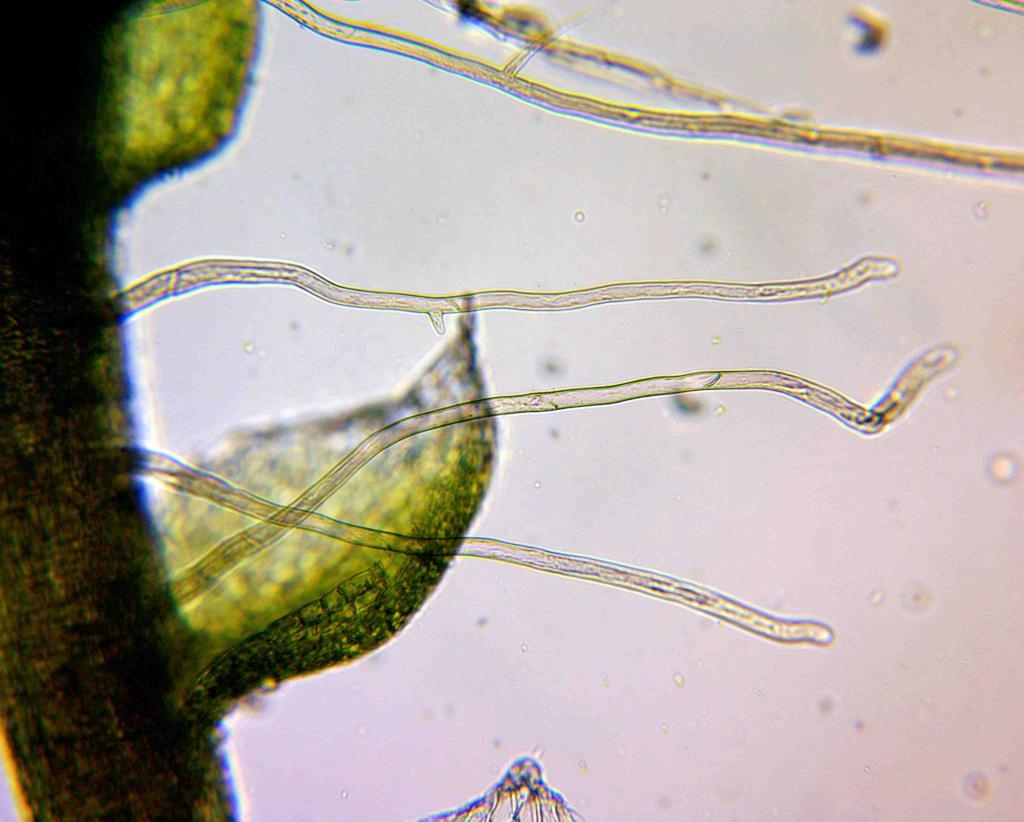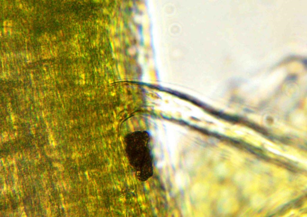 auffällig sind die schrägen zellwände und die "anwuchsstelle", die aussieht als sei es zum moos gehörig.